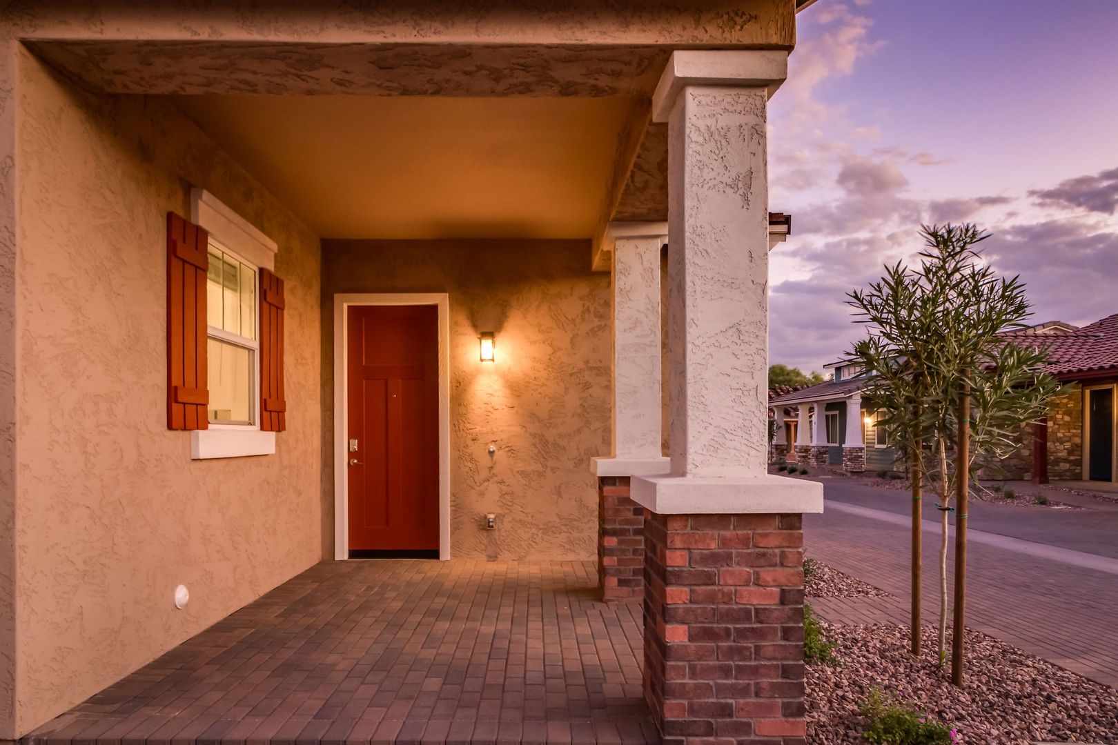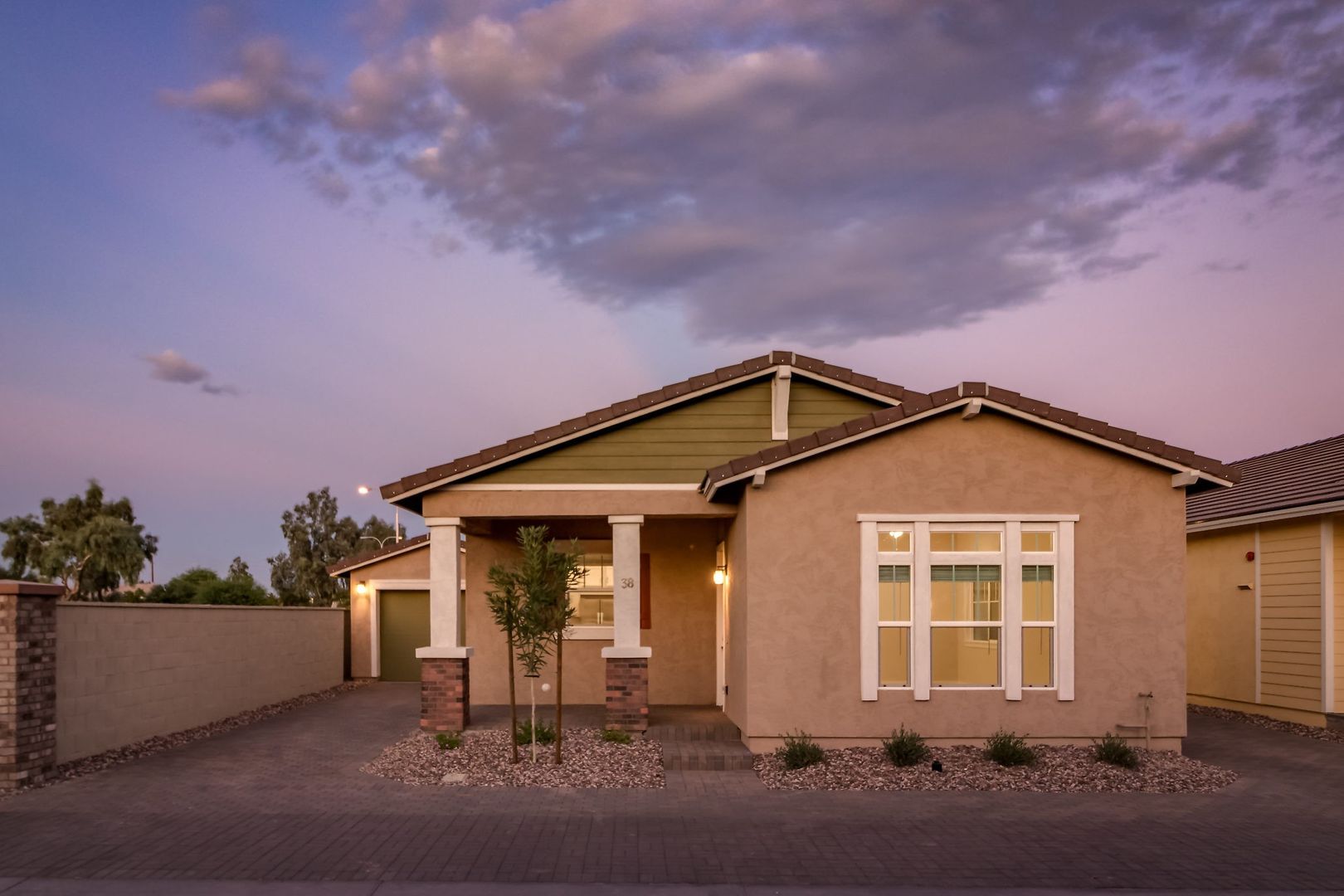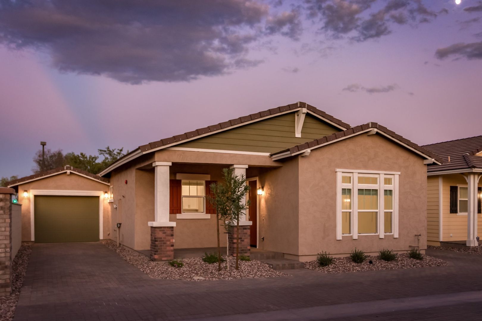 The Thorsen is a traditional Craftsman Bungalow elevation featuring a multi-pane double hung picture window, olive siding, ginger shutters and front door.